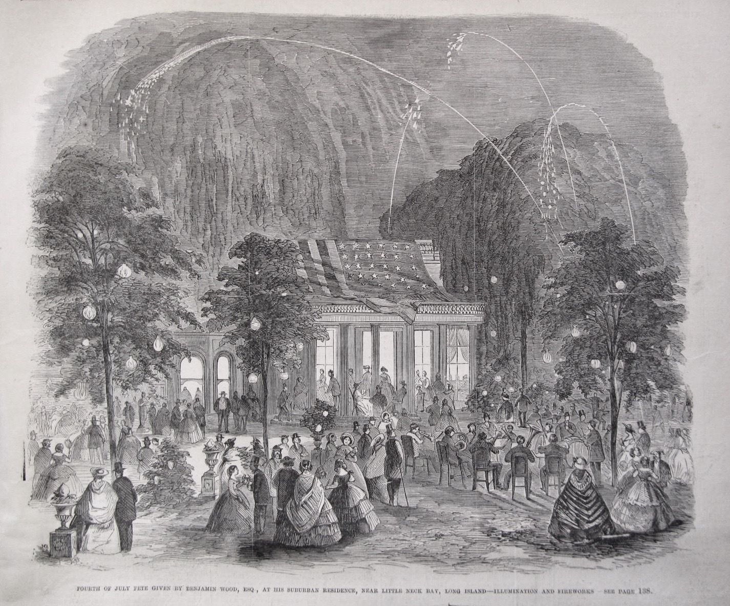 Benjamin Wood’s home originally faced Flushing North Hempstead Turnpike, which was renamed Northern Boulevard sometime around 1900. His extensive property included a twelve-sided stable and a round barn with arched windows, which provided ample room for Wood’s famous July 4th parties, described in an article in Leslie’s Illustrated Weekly of July 1860. The magazine story emphasized the beautiful 60 acres of property and the popularity of Wood’s annual event, which attracted thousands of guests and gave them a “few hours of uninterrupted enjoyment,” including fireworks. The house retains the original fireplace and marble mantelpieces in two rooms.