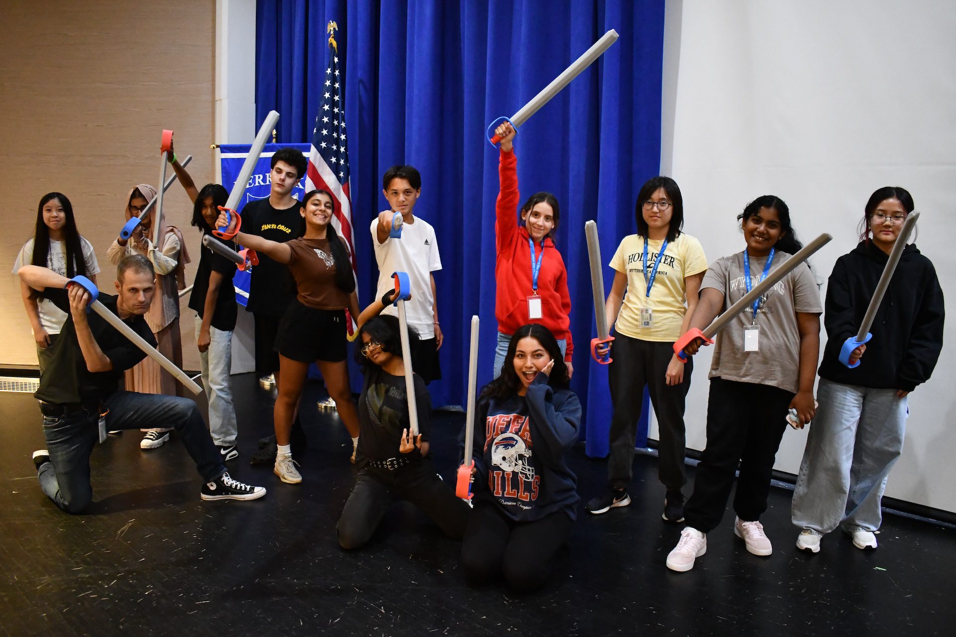 Then, wielding foam prop swords, the students learned basic attacks, defenses and parries, then choreographed their own fight sequences.