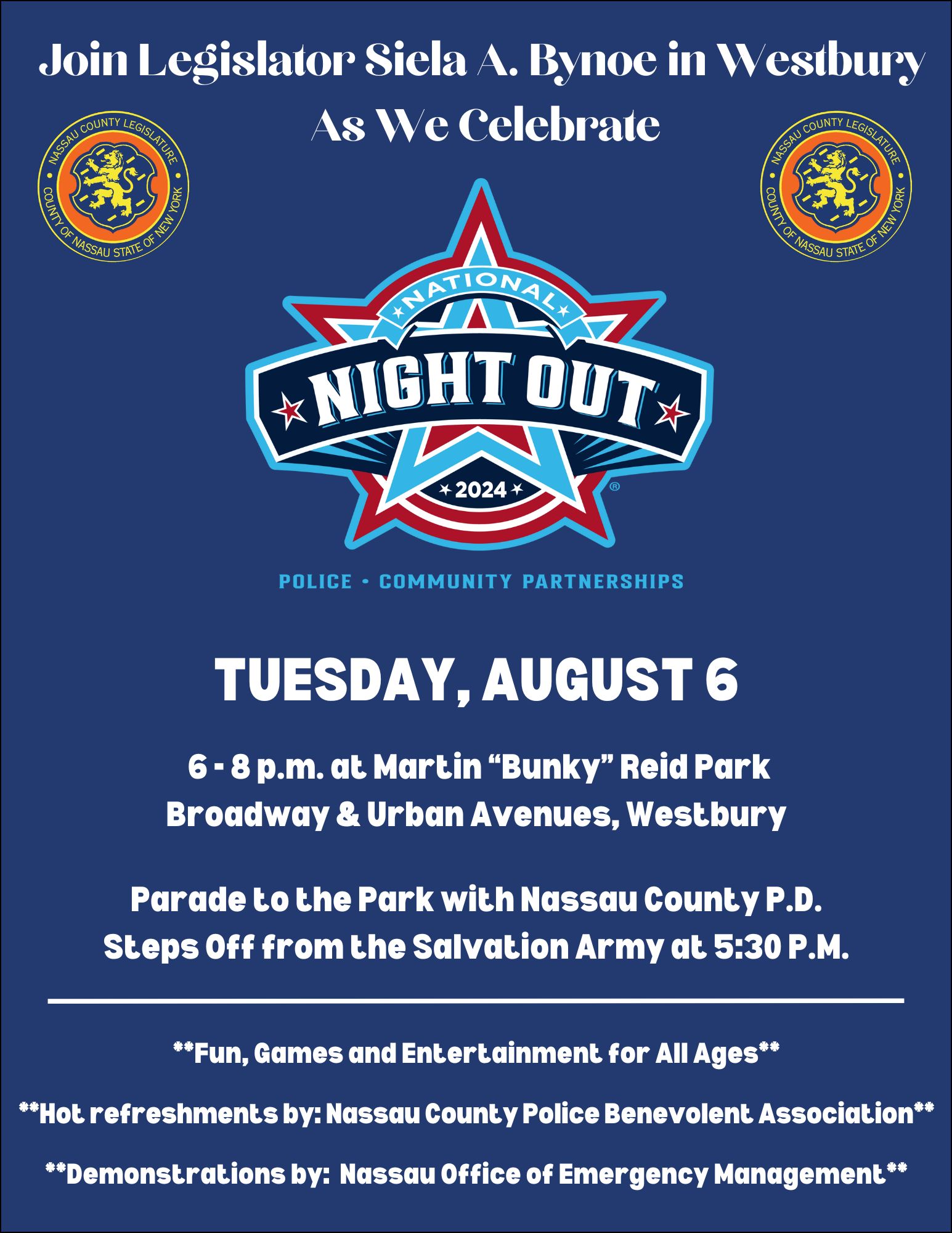 Siela Bynoe, Nassau County Legislature Alternate Deputy Minority Leader, invites the Westbury-New Cassel community to come together on the evening of Aug. 6 to celebrate National Night Out at Martin “Bunky” Reid Park.