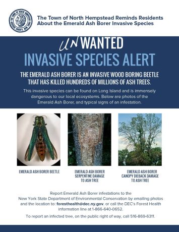 “Ash Trees (Fraxinus) are an important tree species and provide habitat for local wildlife here on Long Island. Tree diversity is important not only because it helps promote pest and disease resistance, but it helps combat climate change and is essential to the overall health of our ecosystem,” said Olivia Cunningham arborist on the town’s tree advisory committee and Nassau County Soil and Water Conservation District. “Ash trees play an important role here on Long Island, by colonizing disturbed areas and stabilizing degraded wetlands. The loss of Ash trees in our canopy due to the Emerald Ash Borer would have a serious impact on our local environment and negatively affect the wildlife that depend on it. We must take action by reporting any suspected EAB infestations and removing these trees to limit the spread.”