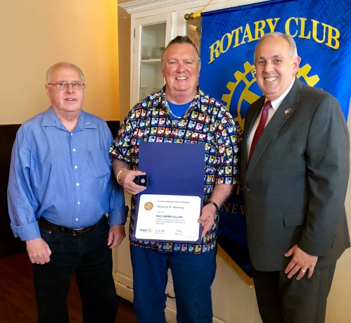 Floral Park – Bellerose Rotary Club President, Tom Reilly, along with rotarian and Floral Park Mayor, Dominick Longobardi, present 40 year affiliated member and Past President, Richard “MoonMan” Mooney, with the Paul Harris Fellowship Award. It is the highest honor that can be bestowed upon a rotarian, for upholding the ideals of RotaryInternational and its Foundation, whose motto is, ” Service Above Self.“