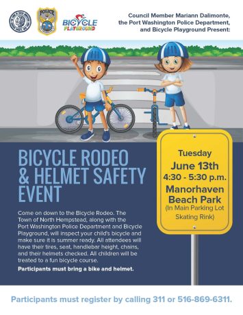 North Hempstead Council Member Mariann Dalimonte in partnership with the Port Washington Police Department and Bicycle Playground are proud to once again host a Bicycle Rodeo & Helmet Safety event on Tuesday, June 13 at Manorhaven Beach Park (Main Parking Lot – Skating Rink).