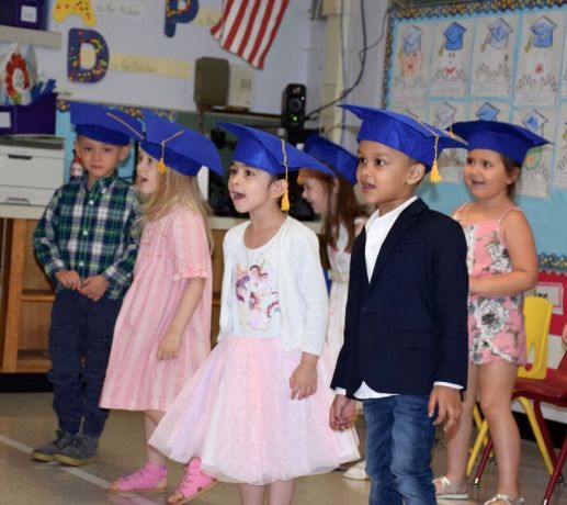 Donning their bright blue graduation caps, students sang “Alphardy,” “Number Rock,” “We’re Moving Up to Kindergarten” and “Pre-K Had Me a Blast” to their class’ visitors.