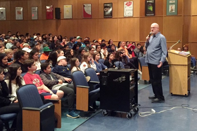 Author James Howe visited Roslyn Middle School and spoke to students on October 19. Mr. Howe is a writer of children’s books and is also the author of several acclaimed novels for older readers, including The Misfits, which was the school-wide reading assignment at the middle school in the summer of 2017. The Misfits inspired the national movement known as No Name-Calling Week, which is observed by thousands of middle and elementary schools each year.