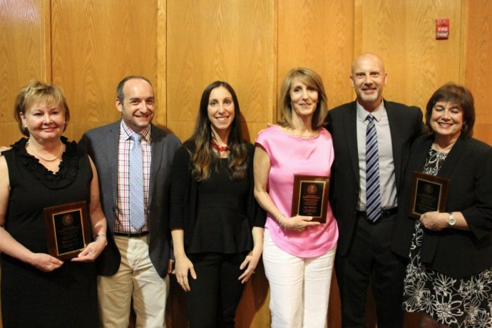 Roslyn Middle School administrators joined together to honor some of the retirees. Pictured are, from left, nurse Pat Collins, Assistant Principal Dave Lazarus, Assistant Principal Claire Scordo, social studies teacher Amy Manzone, Principal Craig Johanson, and computer teacher Janet Dombrowski. (Photo courtesy of Roslyn school district)