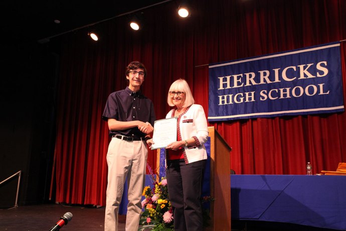 Town of North Hempstead Supervisor Judi Bosworth, Council Member Peter Zuckerman and Town Clerk Wayne Wink attended the Herricks High School Senior Awards Ceremony on June 8 to celebrate graduating seniors George Saketos, Nicole Lis, Dominic Carella and Christopher Kei.