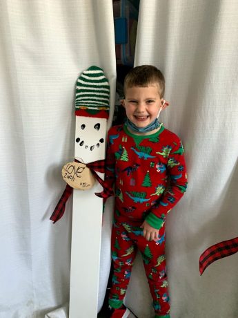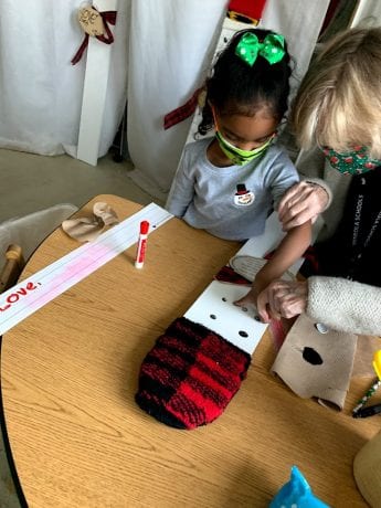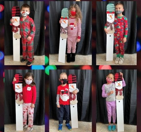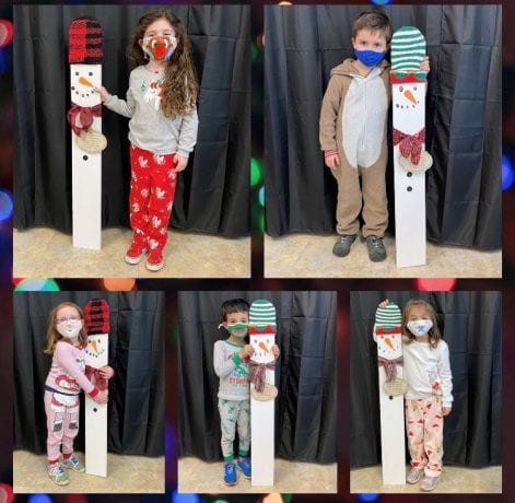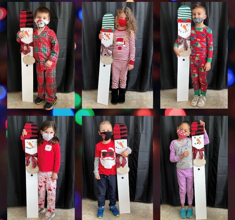High school students helped with the wood cutouts, making them the same height of each student. Then, the kindergartners completed the project by adding on fingerprint eyes and mouths, as well as a hat and a scarf. The personalized projects are sent home and for years to come, they will serve as a festive reminder to families of how tall their students were in kindergarten.