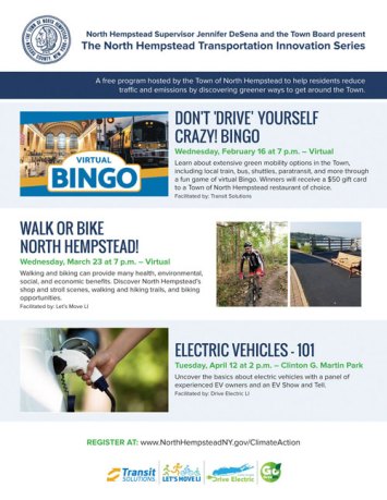 The three-part series focuses on public transportation, active transportation, and electric vehicles. It is part of North Hempstead’s Climate Smart Communities work to reduce greenhouse gas emissions and adapt to a changing climate.