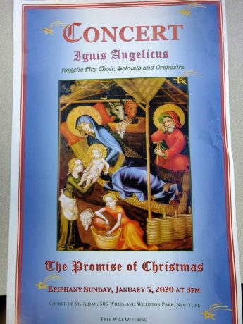 In celebration of the passing of the holiday season, Williston Park’s Church of St. Aidan will be holding a free will offering Christmas concert, “The Promise of Christmas,” on Sunday, Jan. 5, at 3:00 p.m.