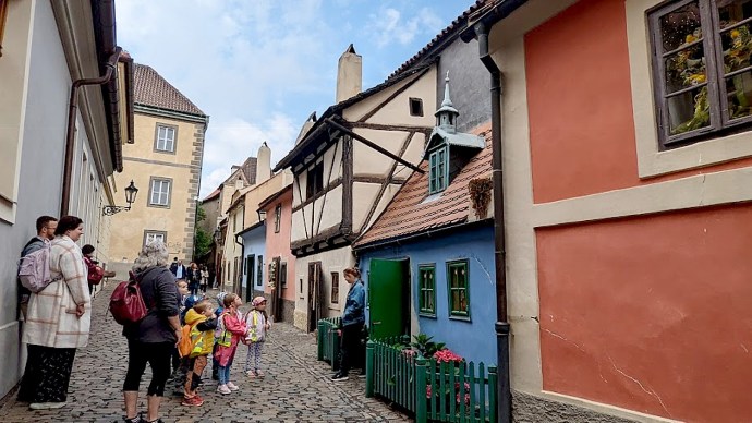 Photo: School kids delight at the fairytale-like tiny house within Prague Castle. Next on their itinerary: the torture chamber of Dalibor Tower ©Karen Rubin/goingplacesfarandnear.com