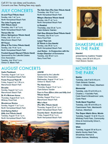 Visit www.northhempsteadny.gov/summer for the Town of North Hempstead Summer Entertainment Calendar or call 311.