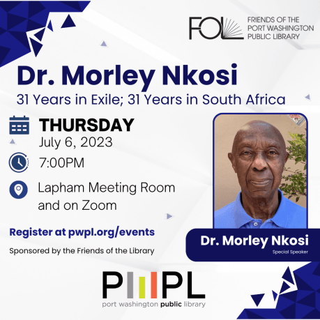 Join us at the Port Washington Public Library on Thursday, July 6, at 7:00 pm as we welcome Morley Nkosi, Ph.D., to hear the compelling story of his life in exile and his return and adjustment to life in Africa.