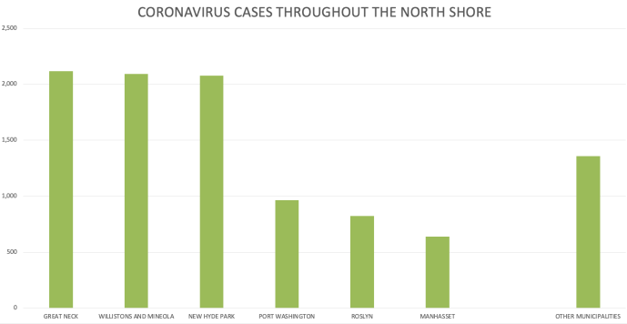 Municipalities and unincorporated areas that stretch into more than one North Shore area such as Flower Hill, Herricks, Albertson, Garden City Park, Searingtown and North Hills were counted separately and accounted for 1,358 cases, according to county statistics.