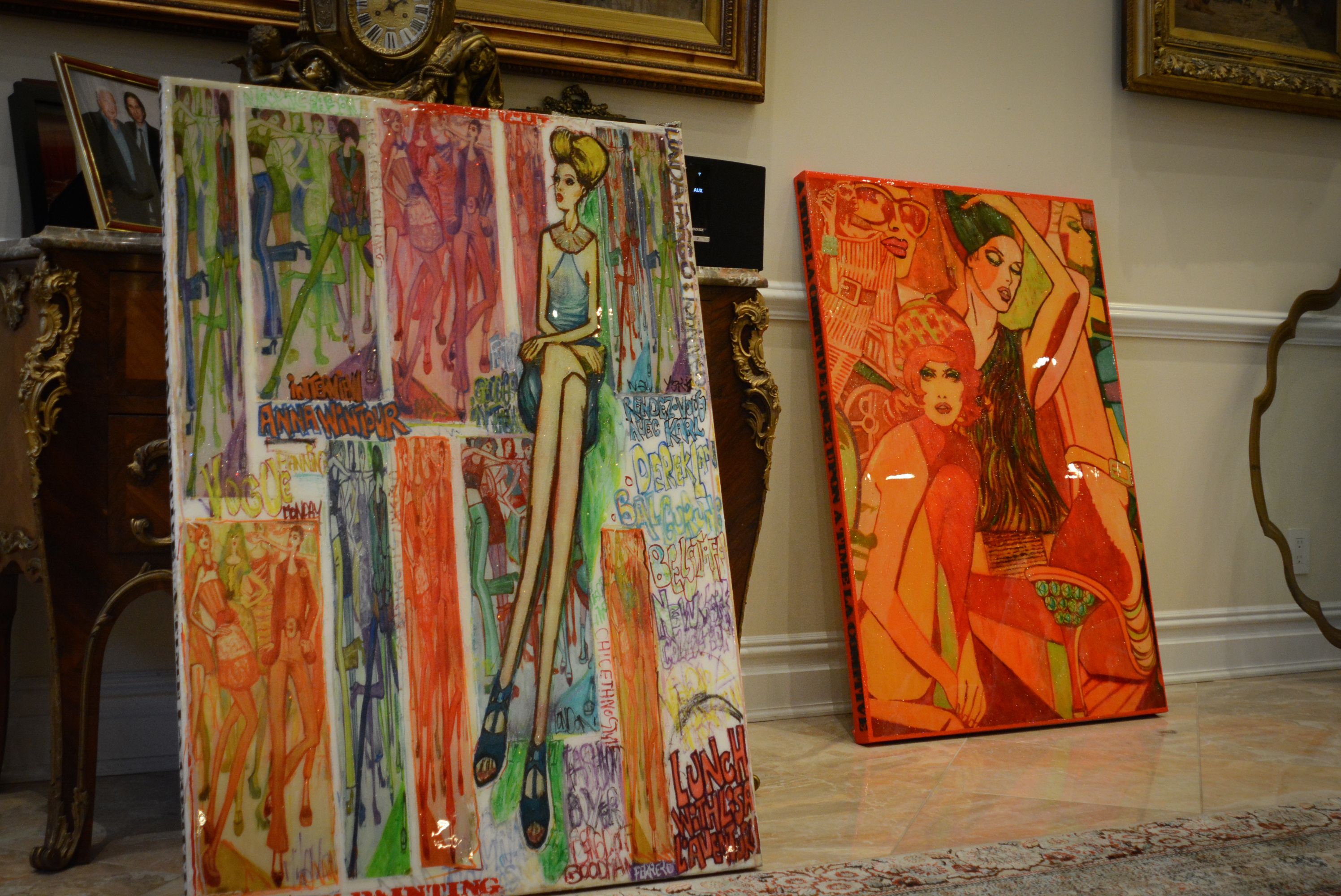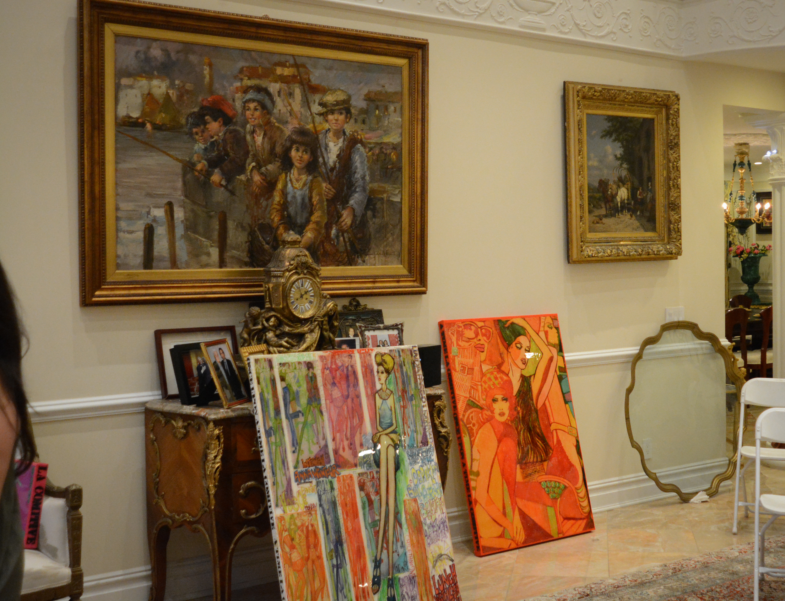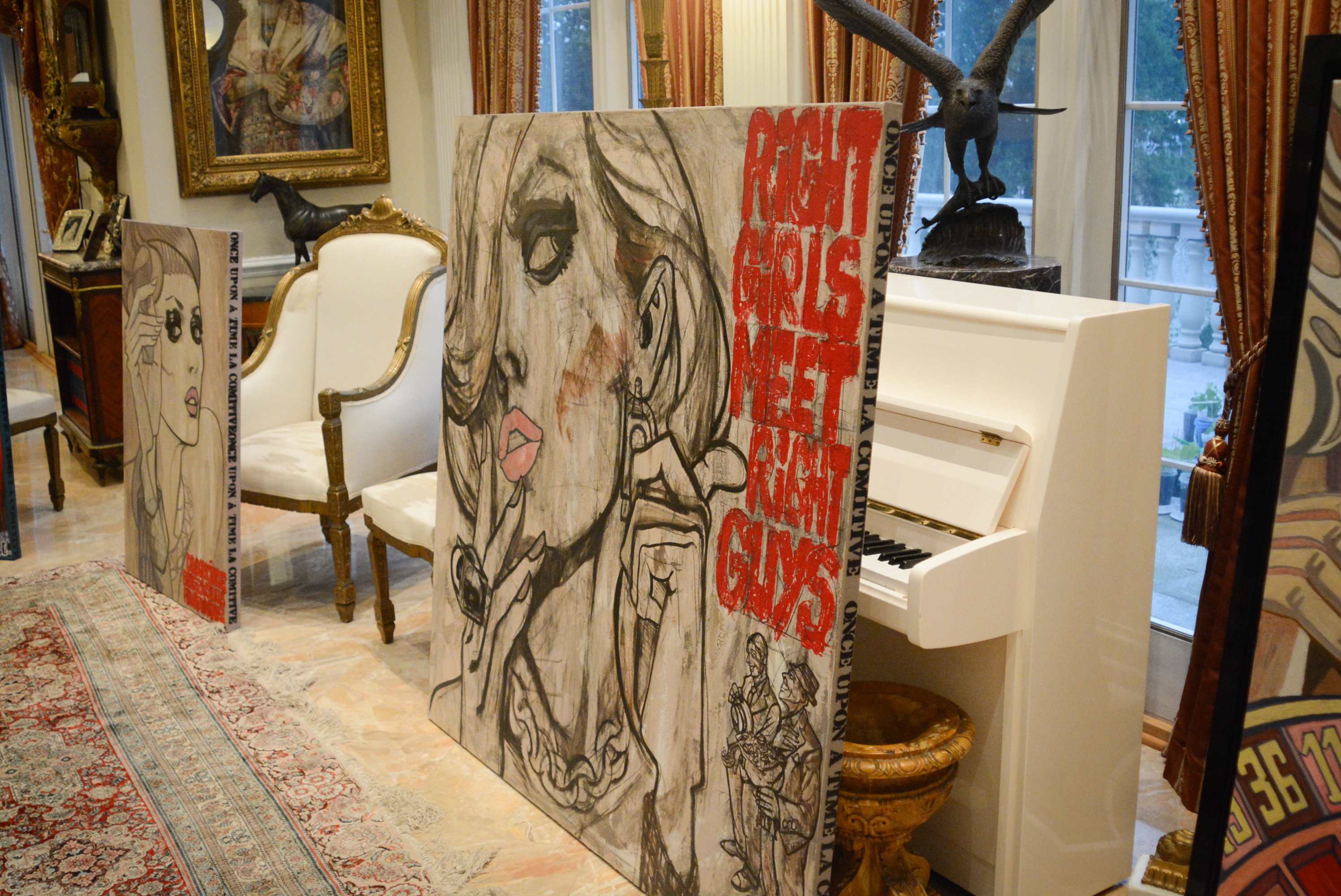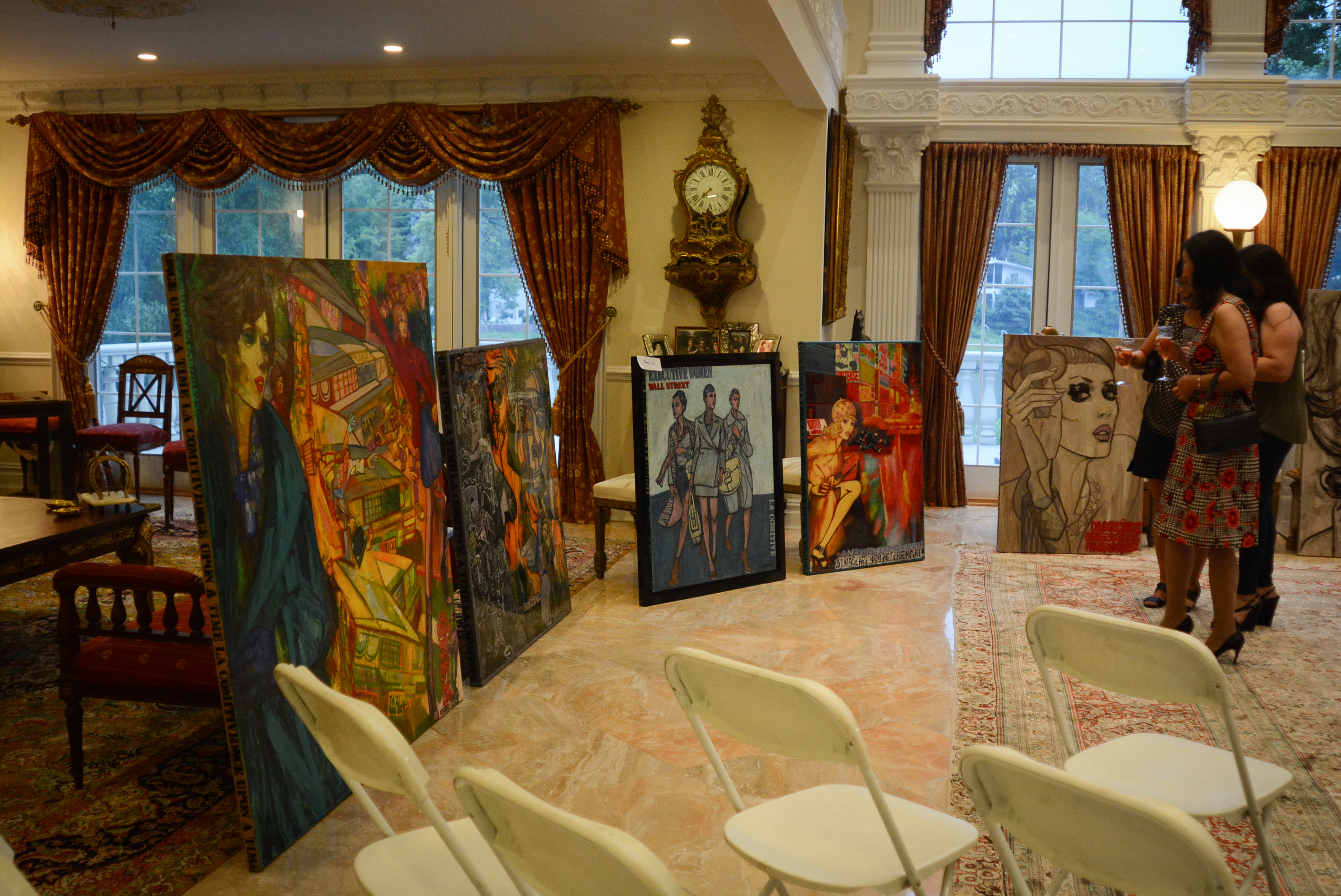 The works here ranged from colorful pieces that could be lined along a small couch, to elaborate ones with multiple characters nearly wide as the mansion’s large windows.