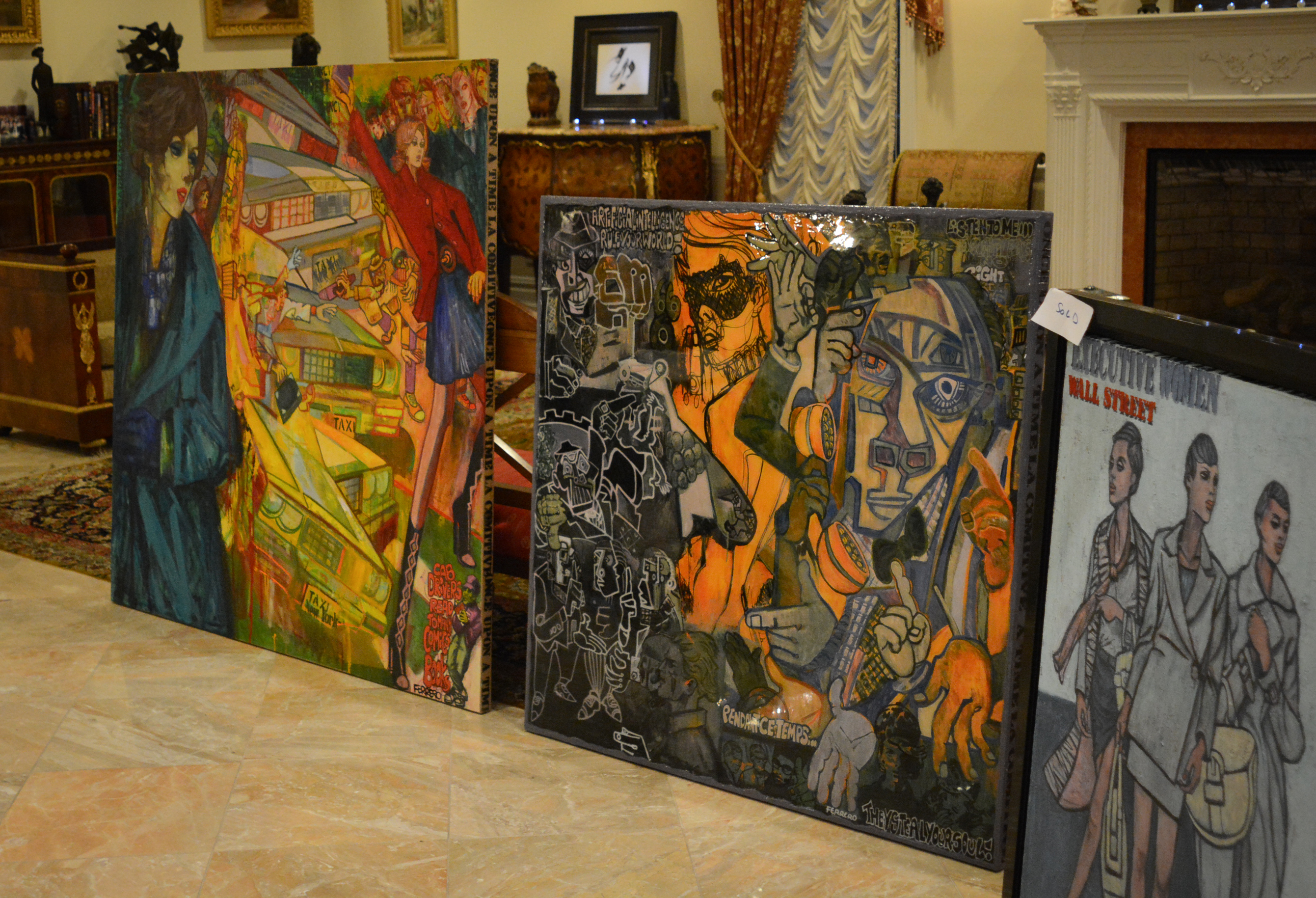 They also saw the exhibited work at its heart: over a dozen paintings for sale by Ferrero, a pioneer of the “storytelling art” movement that blends together artistic styles to create a fictional story.