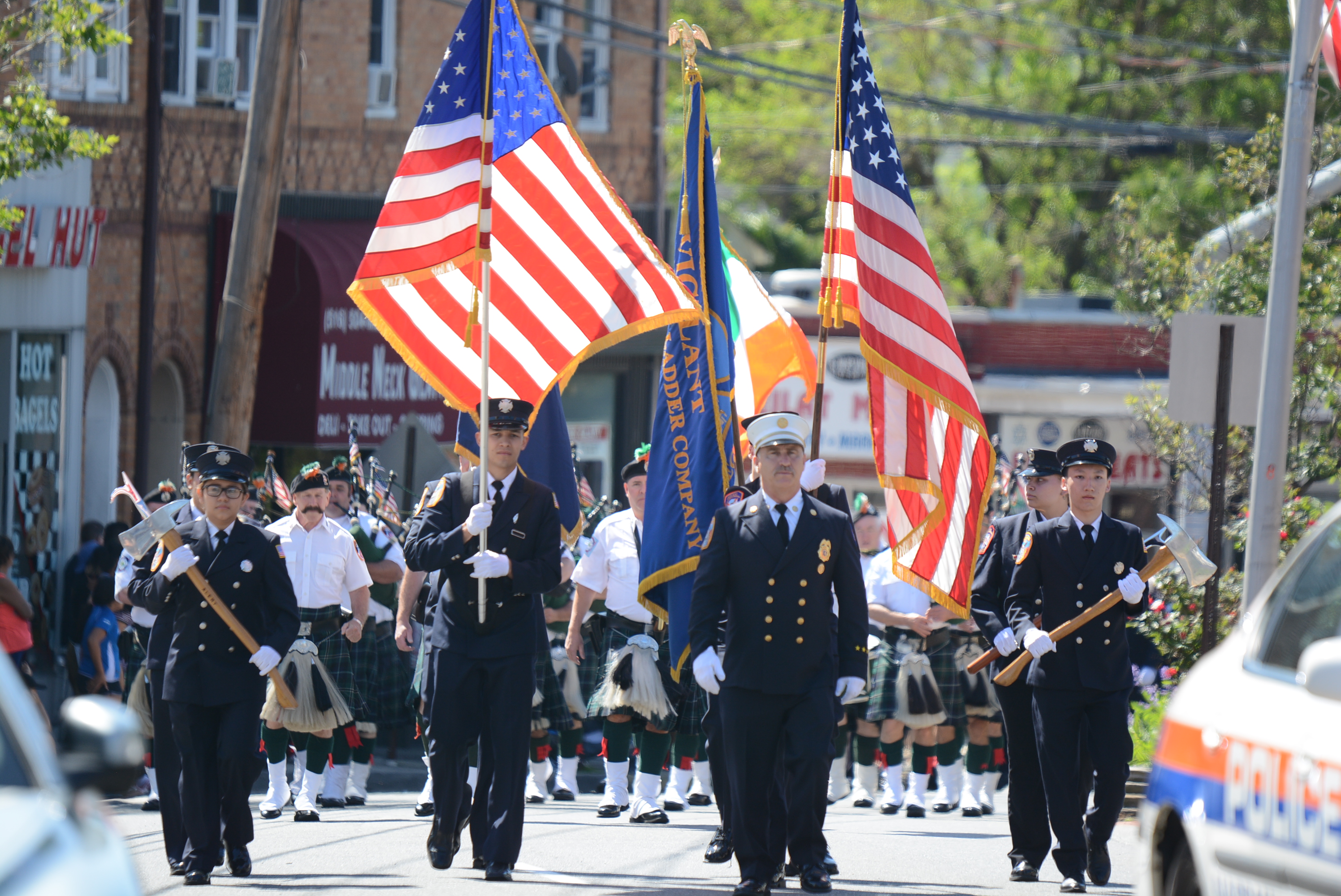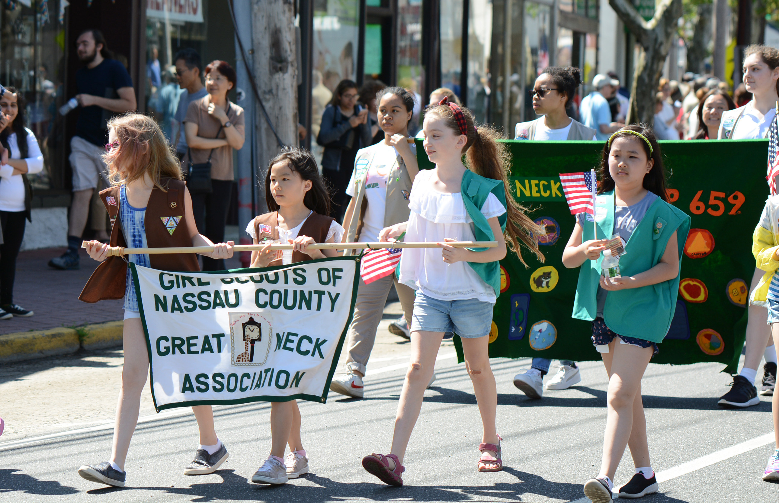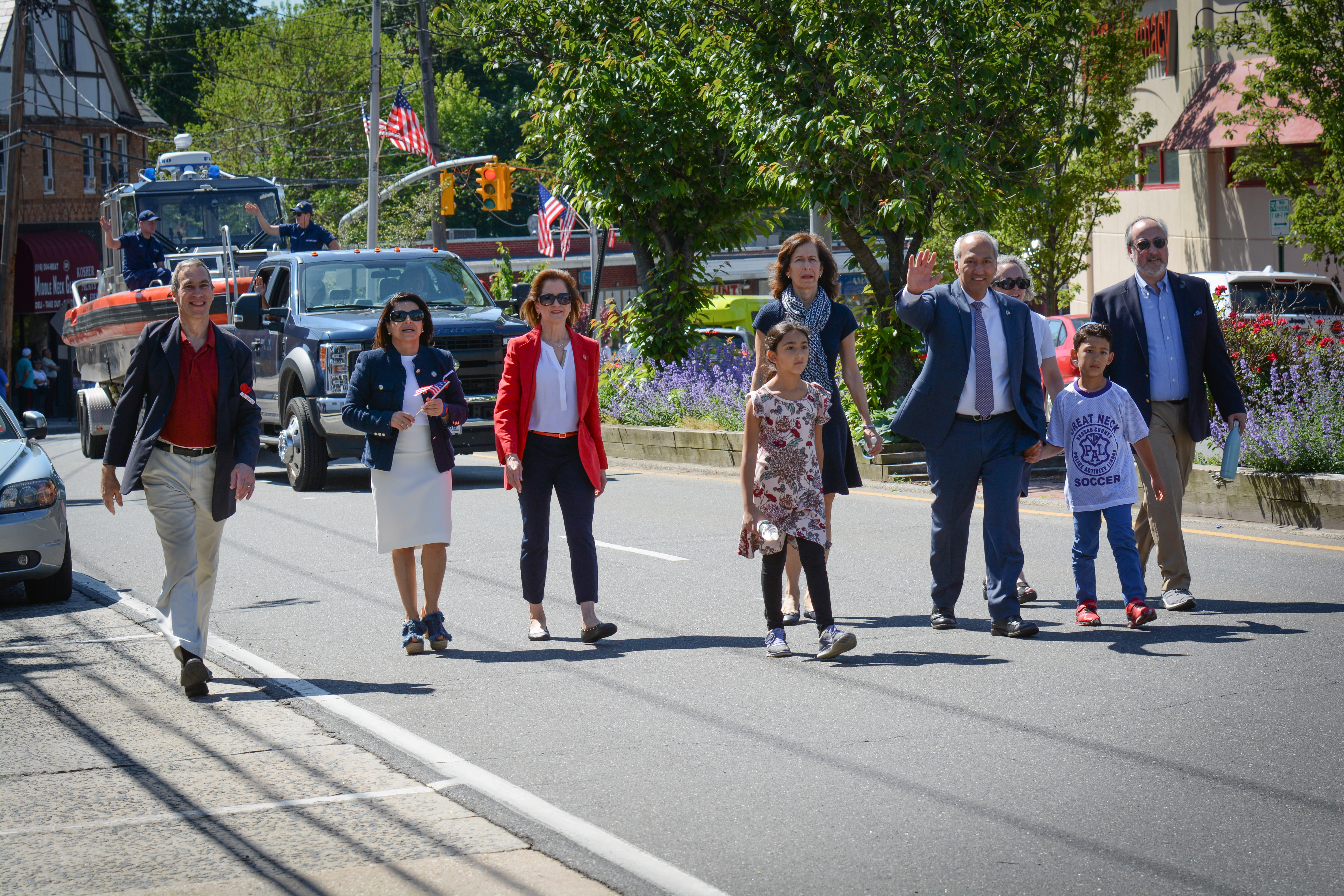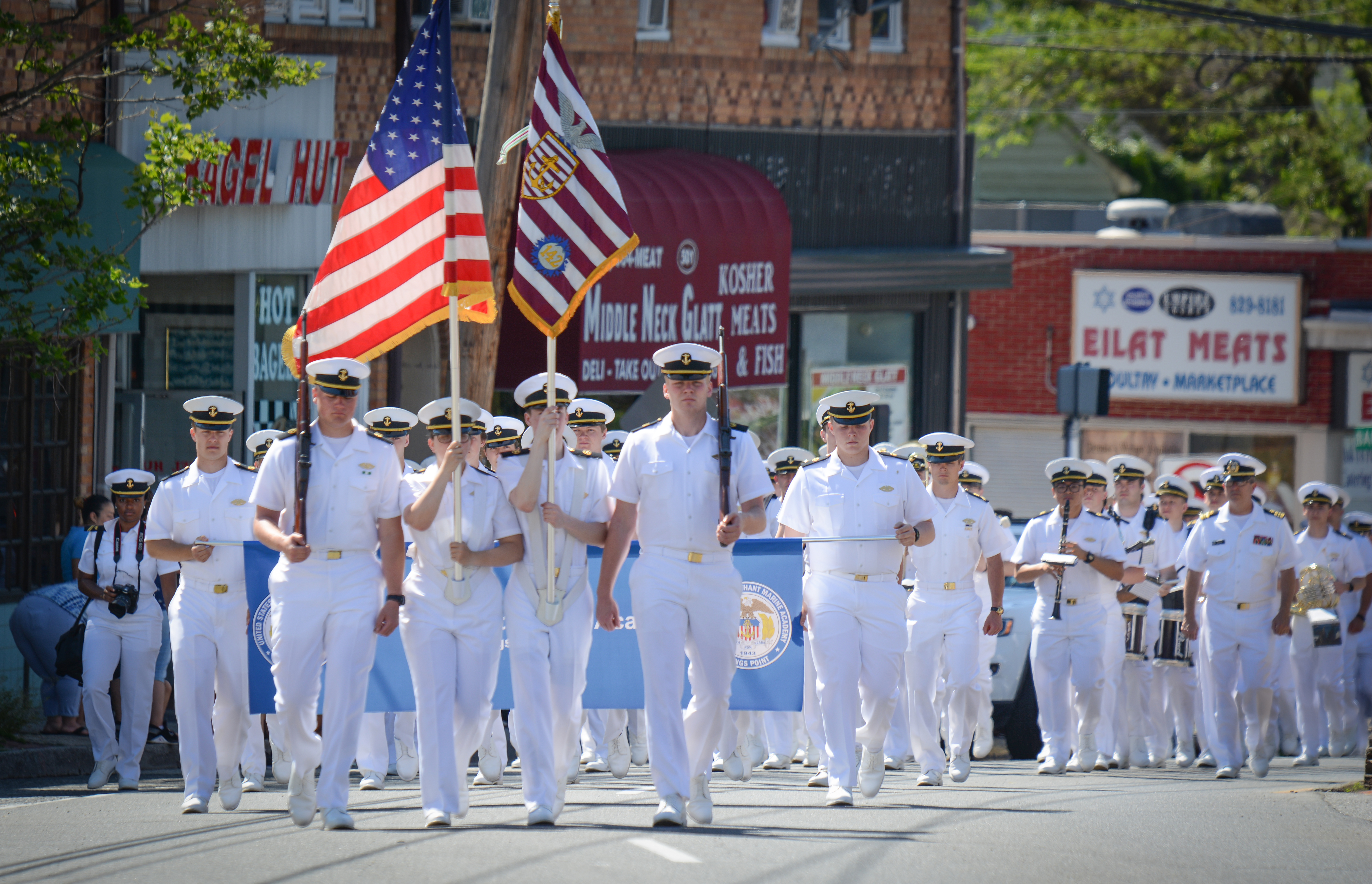 Midshipmen from the U.S. Merchant Marine Academy, veterans groups, Scouts, first responders and elected officials marched up Middle Neck Road, playing tunes, greeting crowds and waving flags. The march stopped at the Village Green for a Memorial Day ceremony to honor veterans.