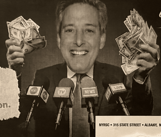 Lafazan, another Democratic candidate running for re-election to continue representing Nassau County’s District 18, is depicted in a mailer holding fistfuls of $100 bills, with his teeth elongated and yellowed, an enlarged nose and smoke rising above his head that casts a shadow of horns.