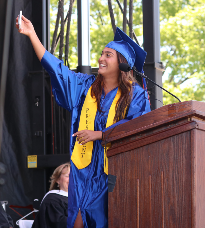 She concluded her speech by taking a selfie on stage, including the entire graduating class.