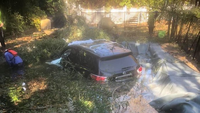 “I heard a loud bang that shook the house,” Wrynn recalled. “When that happened, I ran downstairs. I noticed water all across the windows in the rear of the house, saw that my neighbor’s fence was destroyed. And I looked out to see the roof of a car submerged in the pool.”