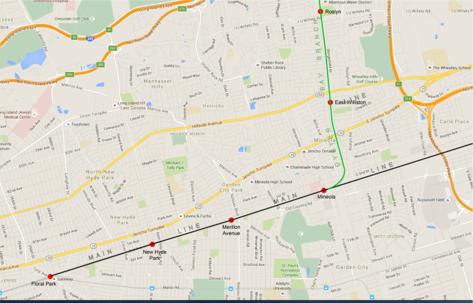 Those trains stop at stations in Mineola, East Williston, Roslyn, Albertson, Floral Park, New Hyde Park and Merillon Avenue in Garden City.