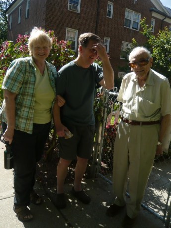 Taking slight advantage of the trip, Halpin stops to greet 91-year-old Herb Lytton, the informal mayor of 21Schenck. Lytton agrees to join the Halpins on their stroll.