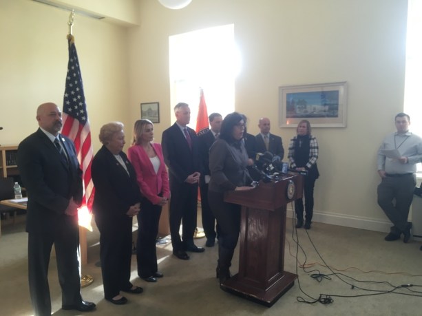 Nassau County District Attorney Madeline Singas, acting Police Commissioner Patrick Ryder and several members of the county Legislature gathered at the Legislative Building Tuesday to announce a proposed expansion of the social host law to combat opioids.
