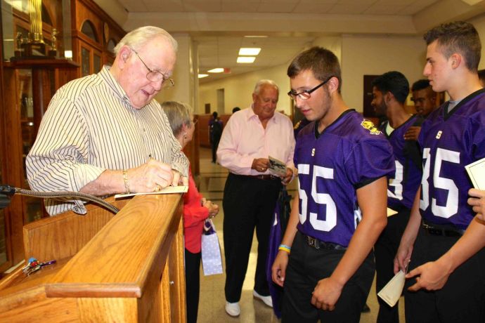 The football, given to Rochester for donation to his alma mater, celebrates the 50th anniversary of the National Football League Championship game and will be displayed in the high school’s Hall of Fame. At the ceremony, Rochester was surrounded by several of his Sewanhaka High School teammates, his former coach Marc Martone, district officials, and Sewanhaka High School administrators as well as members of the varsity football team.