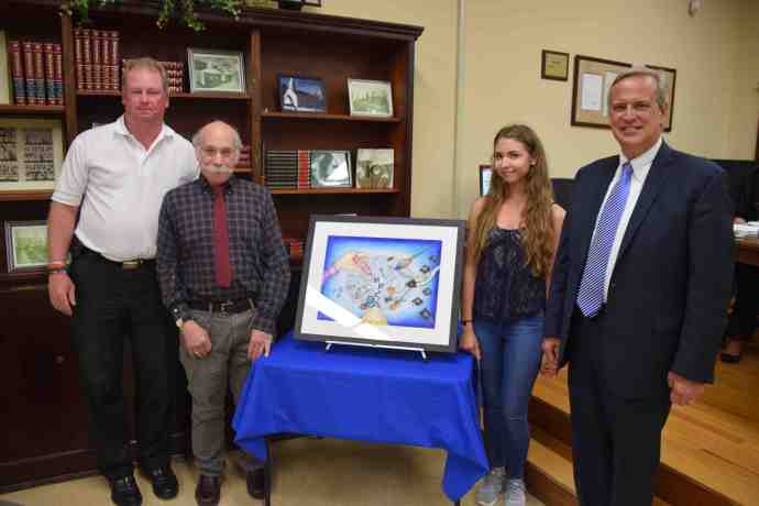 Photo Caption: Herricks Board of Education President Brian Hassan, Herricks High School art teacher Richard Ganes and Superintendent of Schools Dr. Fino Celano (right) congratuled senior Jacqueline Lewittes (center, right) for her design of the 2017-2018 district calendar cover.
