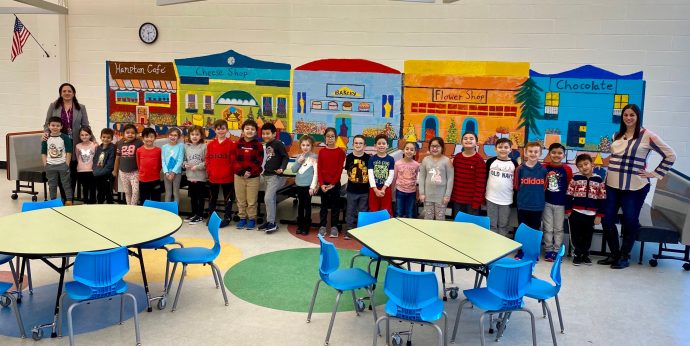 In honor of the new cafeteria completion at Hampton Street School in the Mineola Union Free School District, art teacher Jaclyn Altman and class decided to do something special. She worked with all of the students on drawing a mural for the main cafeteria wall. Will the help of visiting artist John DiNaro, the mural is modeled after a Parisian café street scene. Each of the students assisted in the mural completion.