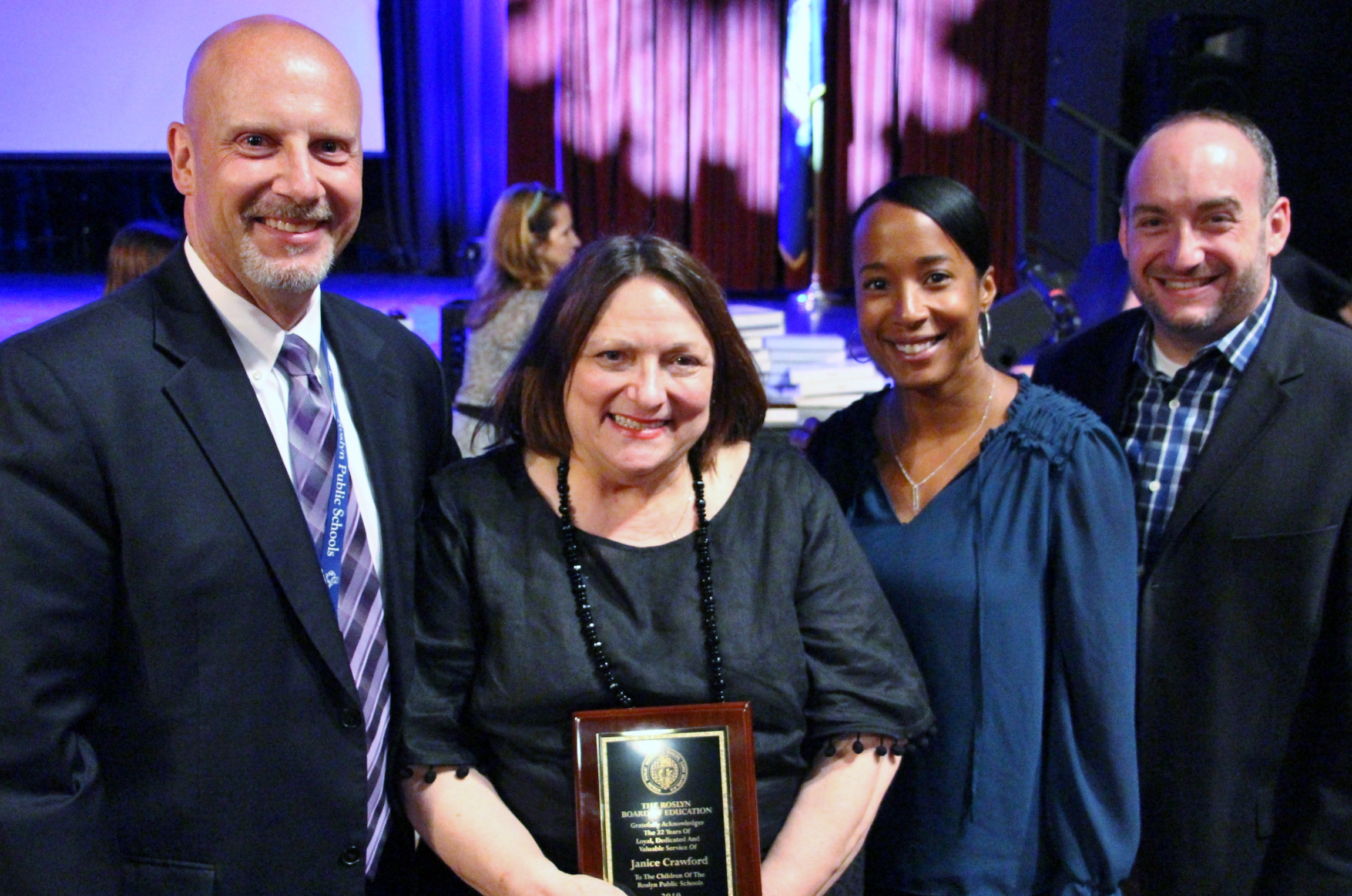 From left, Roslyn Board of Education President Meryl Waxman Ben-Levy, retiree Regina Colardi, Superintendent Allison Brown and board Vice President Clifford Saffron. (Photo courtesy of the Roslyn school district)