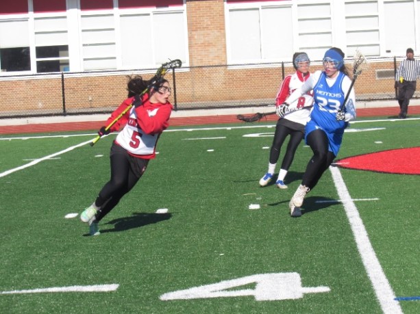 The Mineola Lady Mustangs defeated the Herricks Lady Highlanders 12-4 in lacrosse on Wednesday afternoon, led by Allison Mendes’ four-goal game.