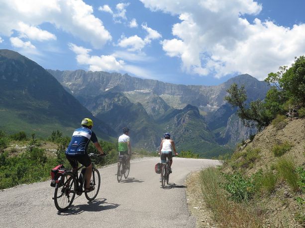 BikeTours.com President Jim Johnson (left) and Junid (middle) riding e-bikes on the mountain roads of Albania © 2016 Karen Rubin/gongplacesfarandnear.com