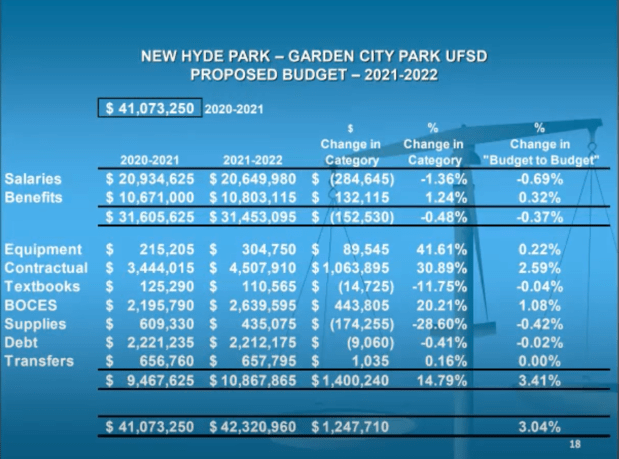 The New Hyde Park-Garden City Park Board of Education recommended a $42,320,960 budget for the 2021-22 school year at a meeting Monday night. The proposed budget is 3.04 percent above the $41,073,250 budget for 2020–21.