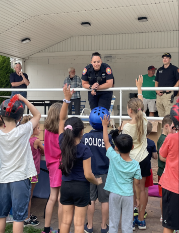 The evening concluded with a Q&A between children and Nassau County Police Officers Alison Adamski and Mark Maguire. The problem-oriented policing officers from the 3rd Precinct answered questions ranging from “what happens when you get hurt in a bicycle accident” to “why did you want to be a cop?” Each child who asked a question received a foam soccer ball or frisbee from the Nassau County Police Department Foundation.
